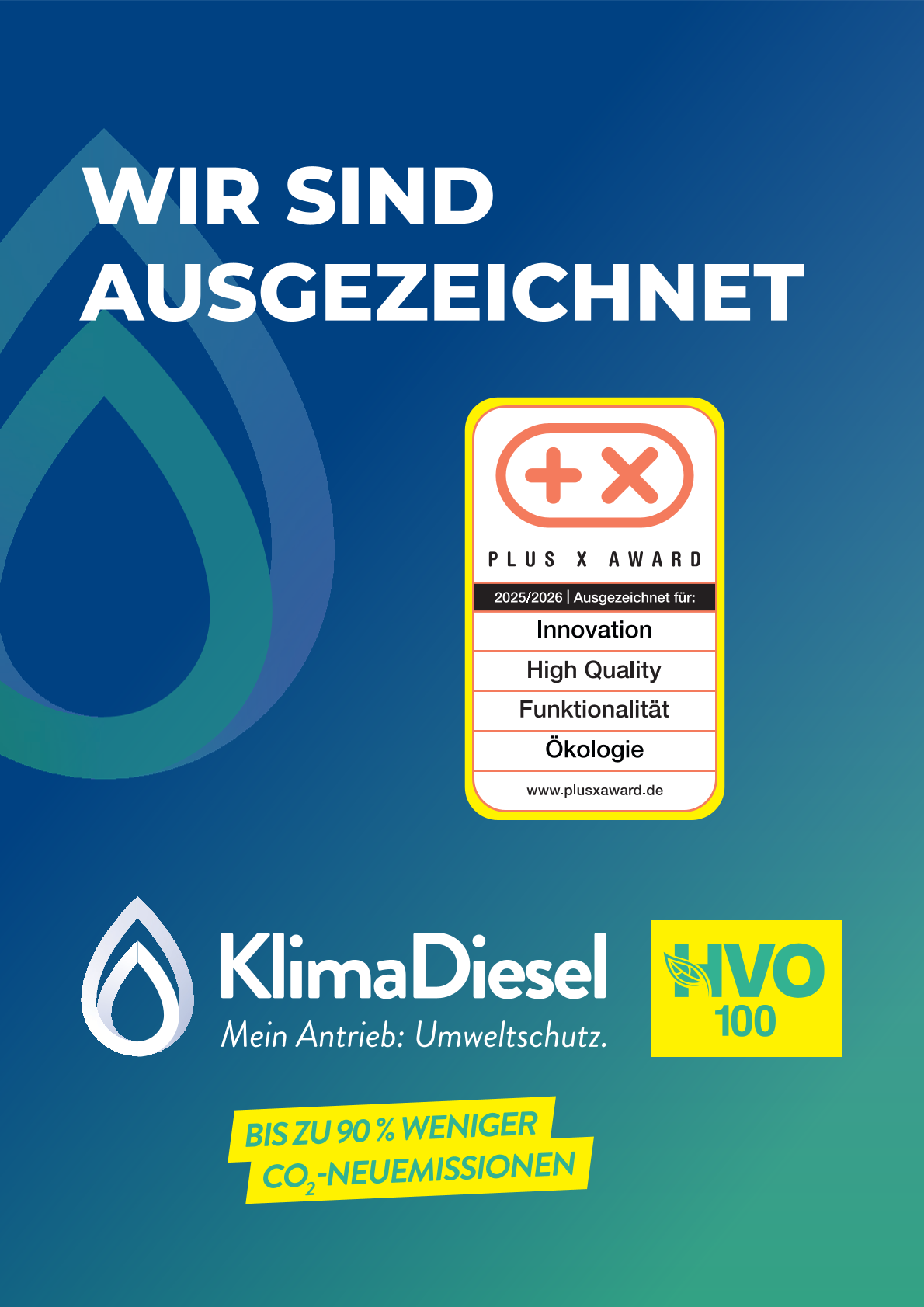 Unser KlimaDIesel 25 besteht zu einem Anteil von bis zu 33 % aus HVO (Hydrotreadet Vegetable Oils). Dieser wird hergestellt aus Abfallstoffen, wie z. B. benutztem Pflanzenfett. Die 25 steht für bis zu 25 % Co2-Neuemissionsminderung gegenüber rein fossilem Dieselkraftstoff. KlimaDiesel 25 erfüllt die hohen Anforderungen der Norm für Dieselkraftstoffe DIN EN 590 und kann somit allem Dieselfahrzeugen genutzt werden.